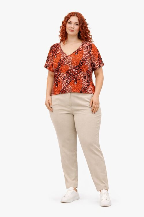 Confeccionada em poliéster leve, possui gola V que valoriza o colo e estampa moderna em tons siena (ferrugem) com detalhes coloridos.