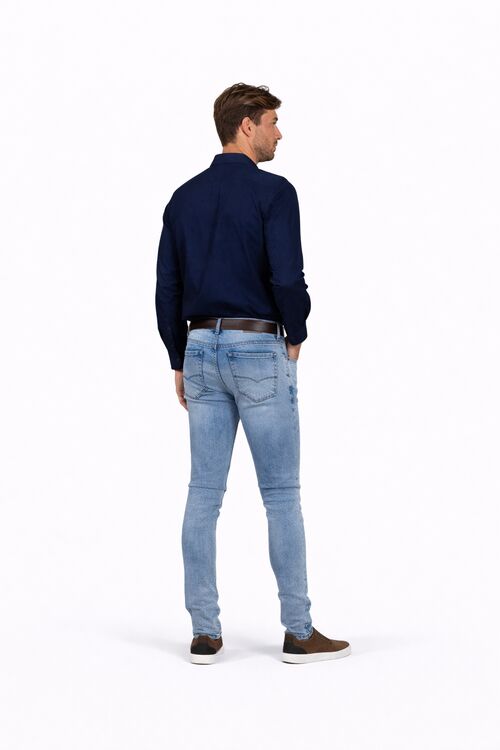 Calça jeans masculina slim Villa Forte com elastano e lavagem Destroyed azul clara. Confortável, moderna e versátil para o dia a dia.