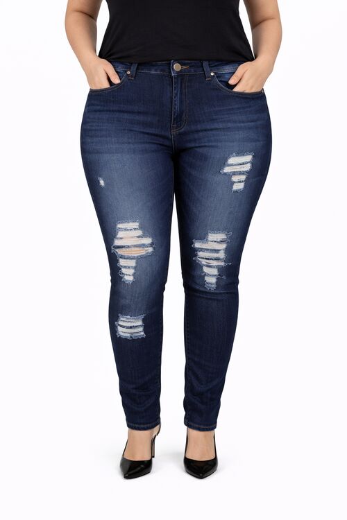 A modelagem ajustada acompanha o corpo, proporcionando caimento confortável e ajudando a alongar a silhueta. A lavagem índigo com detalhes rasgados (destroyed) traz um toque atual e despojado ao jeans.