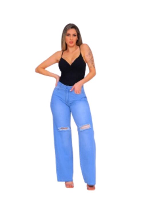 Calça Jeans Wide Leg Feminina Azul Claro Destroyed Shyros