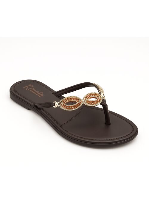 A rasteira feminina cor Café traz um visual clássico com toque sofisticado. O detalhe central em pedraria dá charme na medida certa, enquanto a palmilha macia garante conforto o dia todo. É aquela peça coringa que toda mulher moderna adora ter no guarda-roupa.