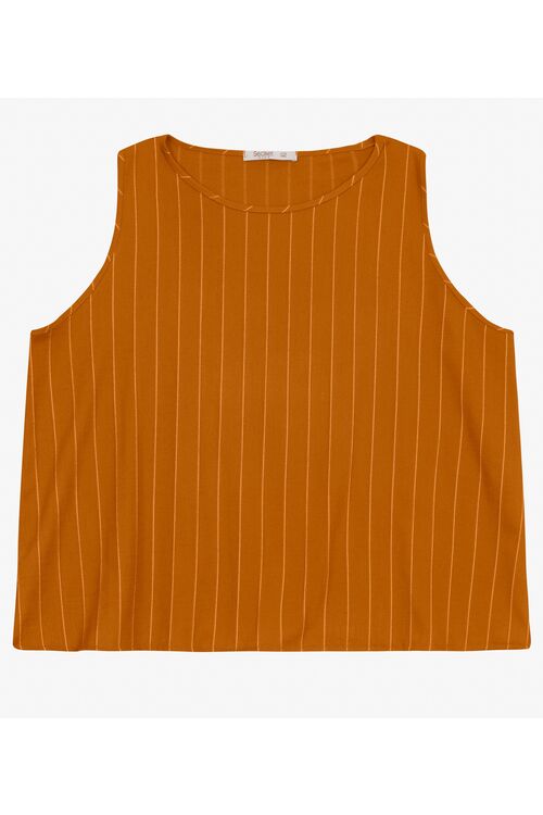 Regata confeccionada em tecido visco com estampa de listras verticais, leve e confortável, ideal para dias quentes. Possui decote arredondado e cavo com acabamento em friso, garantindo mais delicadeza e resistência. A barra conta com bainha fina e acabamento limpo, que proporciona um caimento fluido e um visual moderno. Uma peça versátil que combina com diferentes estilos e ocasiões.