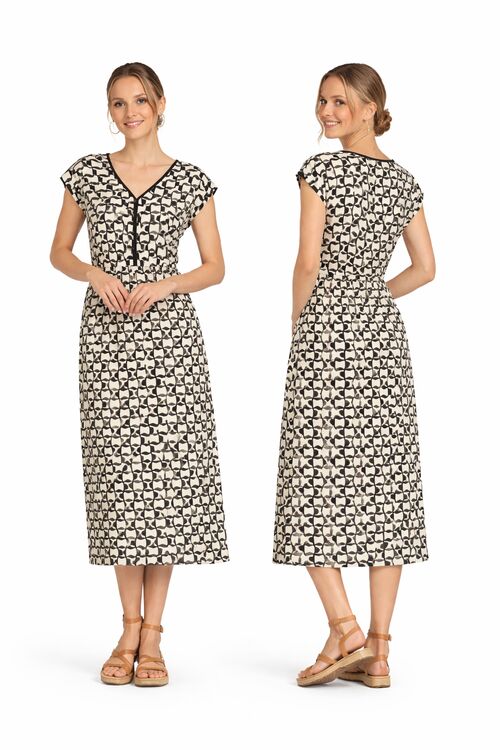 Sua modelagem mídi com gola V valoriza o colo e alonga a silhueta, enquanto o elástico na cintura garante ajuste confortável e define o corpo com naturalidade. A estampa moderna traz personalidade à peça, tornando-a perfeita para o dia a dia, trabalho ou ocasiões especiais.