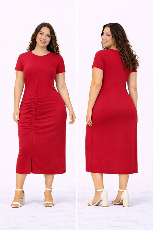 O destaque está no detalhe frontal com costura em elástico, que valoriza a silhueta sem marcar excessivamente, além da fenda frontal que traz modernidade e sofisticação. A modelagem midi é versátil e ideal para diversas ocasiões, desde o dia a dia até momentos mais especiais.