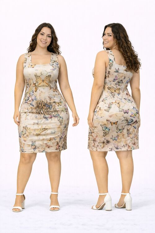 Modelo tubinho que valoriza a silhueta com firmeza e elegância. Estampa marcante em fundo bege com onça e borboletas, trazendo personalidade sem exagero.